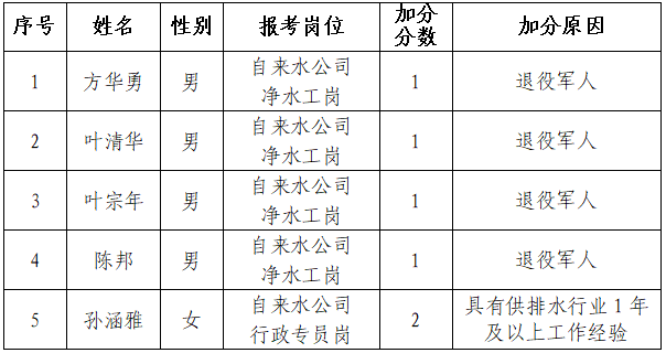 根据《乐动在线注册招聘公告》规定,“对报名参加自来水公司净水工岗位的考生如满足退役军人身份给予综合成绩加1分,荣获个人三等功以上的退役军人给予综合成绩加2分,具有供排水行业1年及以上工作经验者给予综合成绩加2分。对报名参加自来水公司行政专员岗位的考生如具有供排水行业1年及以上工作经验者给予综合成绩加2分”。现对报考人员申请加分的审核工作已全部结束,经审核符合加分条件的人员共5人,现予以公示,接受社会监督。公示时间为2020年11月13日—11月15日。公示期间,如对加分情况有异议,请向黄山市乐动(中国)集团反映。公示期满后,如无异议的,按规定程序办理加分手续,逾期不再补办。联系电话:0559-6525368,15665592628。