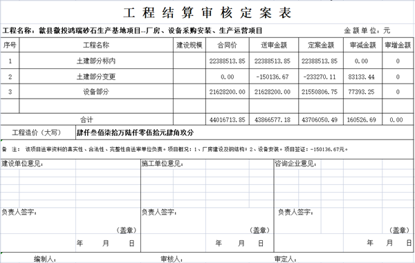 歙县乐动(中国)鸿瑞砂石生产基地项目--厂房、设备采购安装、生产运营项目结算审核定案公示