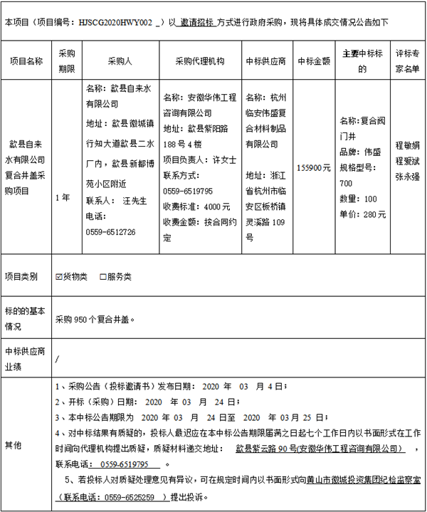 歙县自来水有限公司不锈钢保温水表箱采购项目中标公告