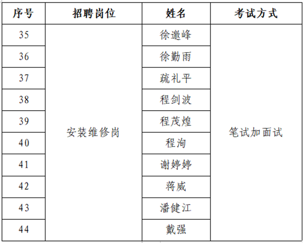 (三)根据招聘岗位数,在同岗位中依笔试成绩从高分到低分,安装维修岗按面试人数与招聘岗位数5:1的比例进行确定,勘探设计岗按面试人数与招聘岗位数3:1的比例进行确定,若达不到开考比例,则取消本次的招聘计划。最后一名如有多名考生笔试成绩相同的,一并确定为面试人员。