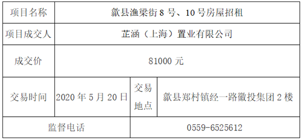 歙县渔梁街8号、10号房屋招租交易成交公告